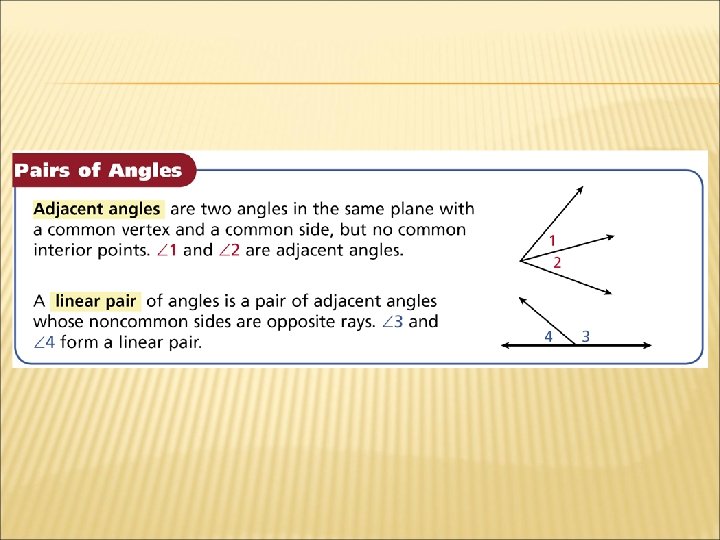 Example 1 A: Identifying Angle Pairs Tell whether the angles are only adjacent, adjacent and form a linear pair, or not adjacent. AEB and BED have a common vertex, E, a common side, EB, and no common interior points. Their noncommon sides, EA and ED, are opposite rays. Therefore, AEB and BED are adjacent angles and form a linear pair.