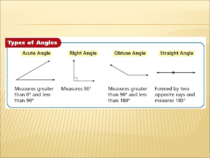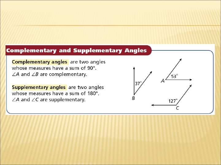 Check It Out! Example 2 Find the measure of each of the following. a. complement of E (90 – x)° 90° – (7 x – 12)° = 90° – 7 x° + 12° = (102 – 7 x)° b. supplement of F (180 – x) 180 – 116. 5° =