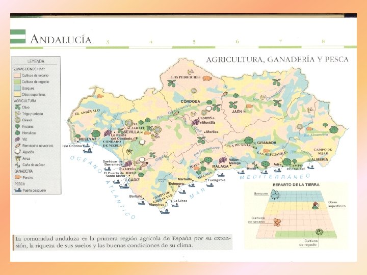 C). LA PESCA La pesca es la obtención de grandes cantidades de pescado para el consumo humano. La comunidad andaluza es la segunda región pesquera de España por la gran extensión de sus costas y por sus buenos puertos y caladeros cercanos (un caladero es un lugar en el mar en donde abunden los peces que se consumen).
