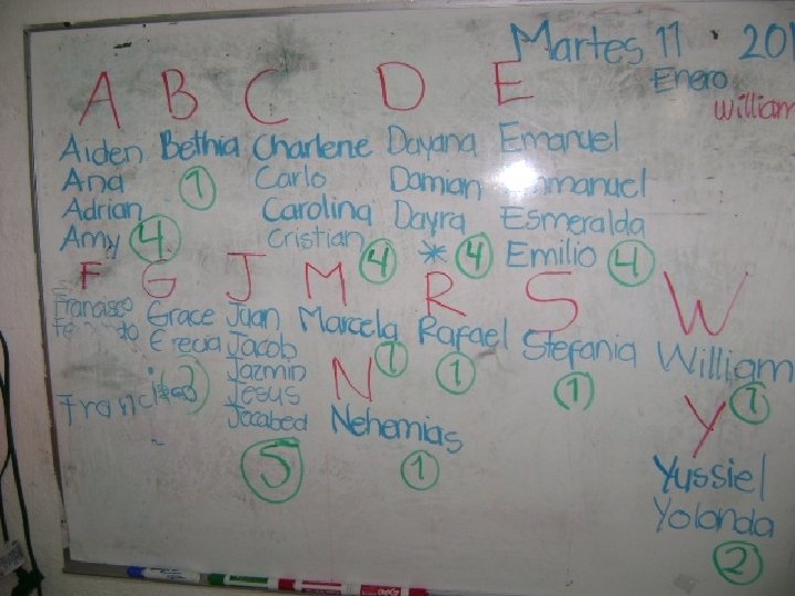 • *Cuantos comienza su nombre con la letra A, B, C, D, E… después se contara y escribirá el numero que corresponde, que inicial tiene mayor número de niños en el grupo. • *Las vocales Se cuestionara sobre cuáles son las vocales, repasarlas, se dejara ejercicios de remarcar las letras, recortar de revistas palabras que inicien con esa vocal o solo la letra. • *Las vocales en mi nombre Se proporcionara una tarjeta con su nombre, deberán contar cuantas letras A, E, I, O, U tienen en su nombre y se registrara en una hoja. • *Vendo mi nombre Pondrán el precio, enseguida realizaran monedas para comprarlos, o fichas con colores que se asignara numero, venderán sus nombres al resto del grupo. • *Remarco mi nombre • *Compitiendo con mi nombre Se formaran 2 equipos se dividirá el pizarrón en 2, tomaran su tarjeta con el nombre, les daré numero a cada niño del 1 al 10, pasaran los numero 1 y escribirá su nombre como pueda, enseguida el numero 2…. Etc, se dará estrella al que lo logre y al que se esfuerce por hacerlo • *Objetos del salón Competencia 2 equipos se dará numero del 1 al 10 pasara numero 1 se pedirán objetos, contaran y se premiara al que los lleve correctamente • *Cuento y escribo el numero • *Uniendo los objetos