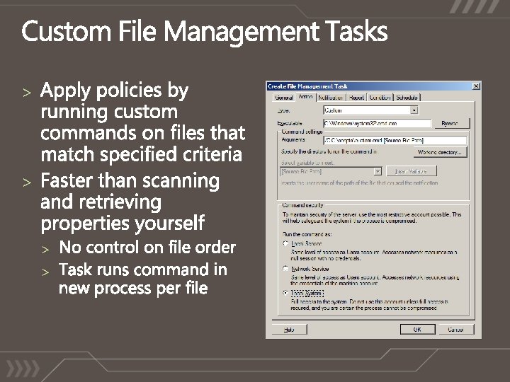 Each module passes streams of property bags to the next one Streams can cross processes • Security checks are performed on crossprocess data transfers Classification Runtime Process Scanner Office Storage [Load] Folder Classifier Content Classifier Office Storage [Save] Reporting Engine Gets basic file properties Loads embedded properties Classifies based on location Classifies based on content Saves embedded properties Adds files to report Hosting Process Discover Data Extract Properties Classify Data Store Properties Apply Policies Most modules are hosted within a separate process