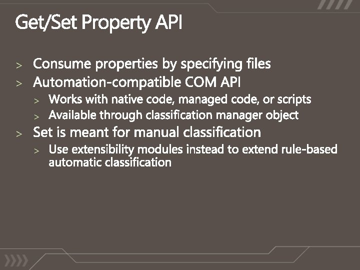 Using native C++ // Get an instance of the Classification Manager IFsrm. Classification. Manager sp. Class. Mgr Co. Create. Instance CLSID_Fsrm. Classification. Manager IFsrm. Classification. Manager sp. Class. Mgr // Get the "PII" property bstr. Filename bstr. Prop. Name IFsrm. Property sp. PIIProp sp. Class. Mgr Get. File. Property bstr. Filename bstr. Prop. Name sp. PIIProp