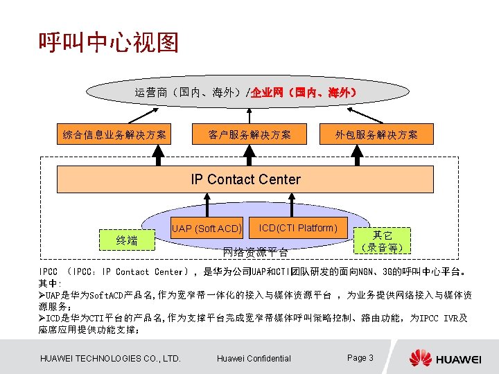IPCC系统组件 Dt. Proxy Web Server 第三方系统 Web. M IVR Email Server Mail. M CCS UIDB Ap. Logic File Server PSTN/PLMN WAS UAP CTI-Link MCP CTI Server 3 G/NGN SIP HUAWEI TECHNOLOGIES CO. , LTD. Huawei Confidential Page 11 座席