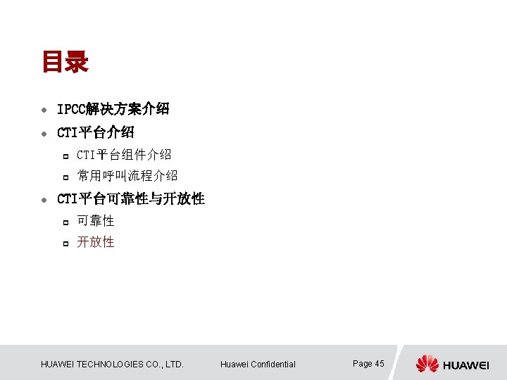 分层系统架构,标准化接口 Application Agent Assisted Integration Self Service Integration Active. X API CRM ERP Billing Etc. API Service Platform SCE /IVRIDE Vxml CCXML Active. X API JTAPI CTI API IVR API INtess CSTA Soft ACD/MSP XX 设备提供商或ISV提供的客户化业务应用 HUAWEI TECHNOLOGIES CO. , LTD. XX 呼叫中心系统 Huawei Confidential XX Page 46 第三方系统 Voice /Video Log