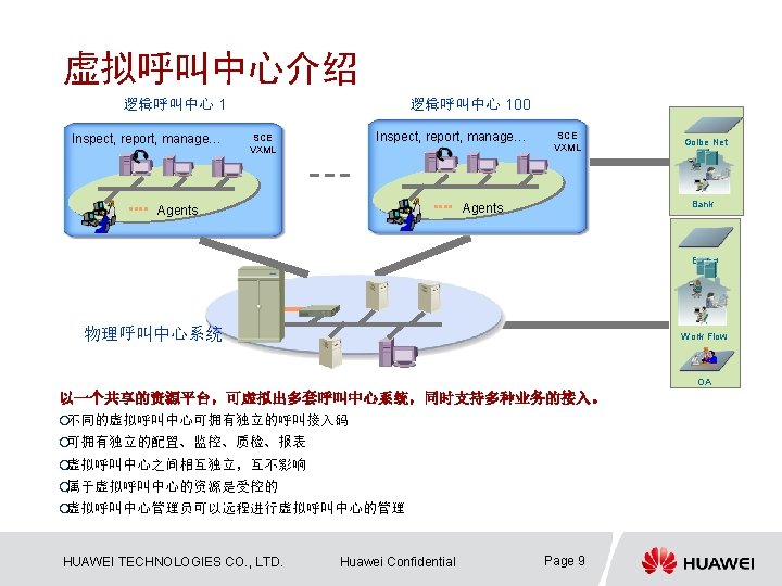 IPCC系统架构 业务实现层 业务支撑层 自动语音服务 人 坐席服务 交互式语音应答IVR 呼叫中心核心服务器CCS 网管系统 I 2000 媒体适配层 CTI媒体服务器 CTIServer 媒体接入层 排队机 UAP Video HUAWEI TECHNOLOGIES CO. , LTD. SMS/MMS Email媒体服务器 Mail. M 多媒体服务平台MSP PSTN/PLMN NGN/3 G Voice WEB媒体服务器 Web. M Internet Web Huawei Confidential Email WAP Push Page 7