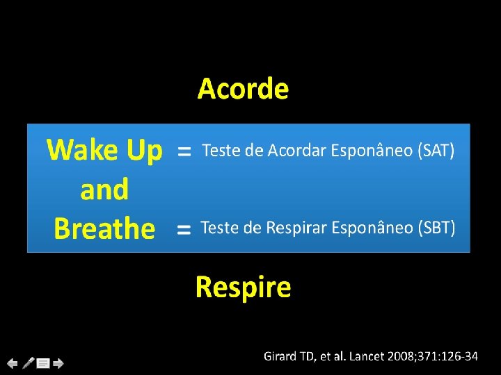 Acorde e Respire – Extubação Pacientes Extubados com Sucesso (%) 100 80 SAT + SBT (n=167) Cuidado padrão + SBT (n=168) 60 40 Aumentaram os dias livres de Ventilação no grupo 20 3. 1 dias 0 p=. 02 0 7 14 Days 21 28 Girard TD, et al. Lancet 2008; 371: 126 -34