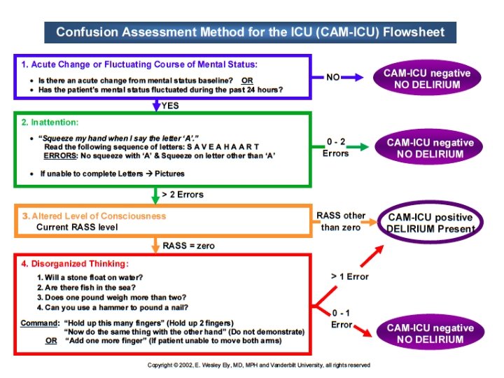 CAM-ICU � Confusion Assessment Method for the ICU � Step one – check level of consciousness (RASS ≥ -3) � Step two – check content of consciousness ◦ Acute or fluctuating changes AND ◦ Inattention AND ◦ Altered level of consciousness OR disorganized thinking