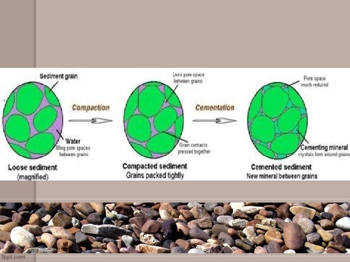 • Cementation takes place when dissolved minerals are deposited in the tiny spaces among the sediments.