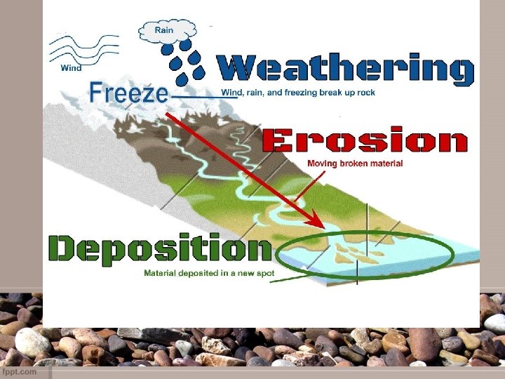 • Erosion involves the weathering and the removal of rock. • As soon as a rock particle (loosened by weathering processes) moves, we call it erosion