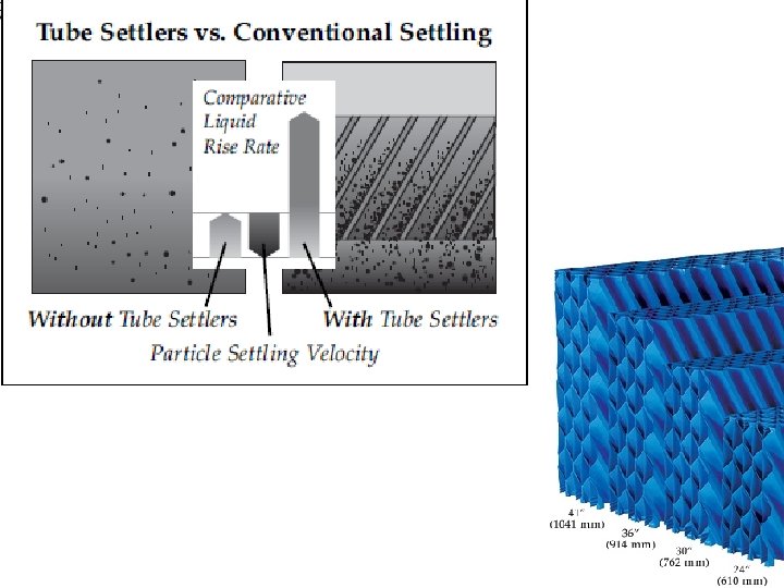 Enhancement of sedimentation basin performance • Inclined surface – Basic features • Using inclined trays, tubes or plates spaced closely • The depth of basin is divided into numerous channels • The depth of fall of particles is reduced • The settling time required is reduced • Flow is laminar • Provide large surface area and low hydraulic loading • Insignificant wind effect