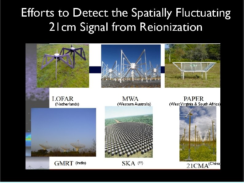 Concluding Remarks ● Probe Dark Ages, First Luminous Objects, reionization, postreionization ● Potential Probe of Dark Energy ● Challenge Foregrounds, RFI