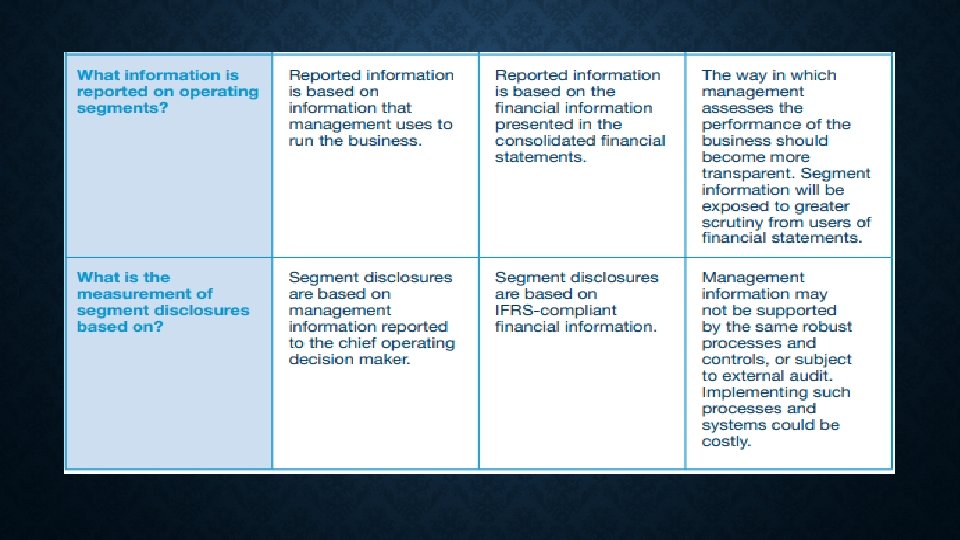 SCOPE OF IFRS 8 • IFRS 8 applies to the separate or individual financial statements of an entity (and to the consolidated financial statements of a group with a parent): • whose debt or equity instruments are traded in a public market or • that files, or is in the process of filing, its (consolidated) financial statements with a securities commission or other regulatory organisation for the purpose of issuing any class of instruments in a public market