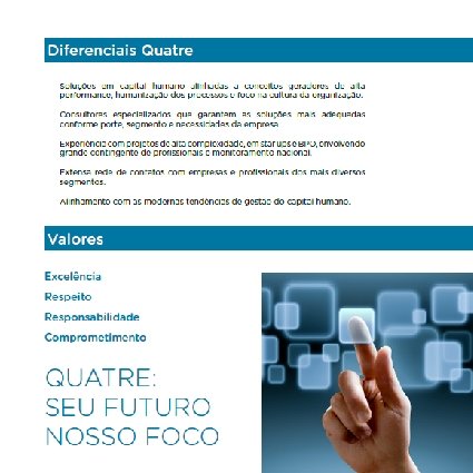 REFERÊNCIAS Quatre Company has been our partner for a long time. Since I've arrived in Fiat Powertrain as responsible for ICT area for all Latin America plants, I've been working with Quatre in several hiring. In these demands, the commitment with our goals and necessities, their ethics and professionalism, has been help us to reach our achievements. Actually, my relationship with Quatre started before, when I was in the other side as a candidate. So, I can give my testimony as someone which was in the other side; the excellent treatment and professional behavior is not different, what make me confident to have Quatre as our partner. So, I feel comfortable to give my endorsement to Quatre Company. Best Regards, Olavo Soares LATIN AMERICA CIO FPT – Fiat Power. Train Technologies Currently as CIO at Luft Group olavosoares@gmail. com