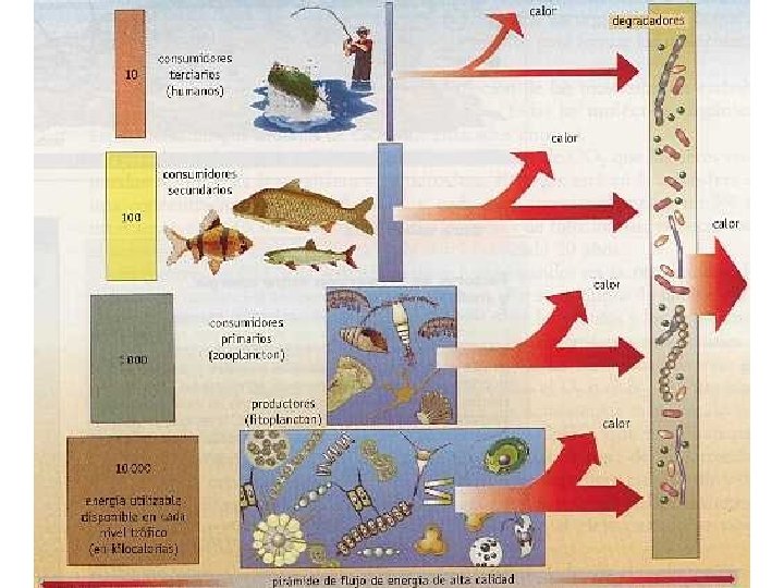 Pirámides de energía En estas pirámides se representa la producción neta de cada nivel trófico; es decir, la energía queda disponible para el nivel trófico superior.