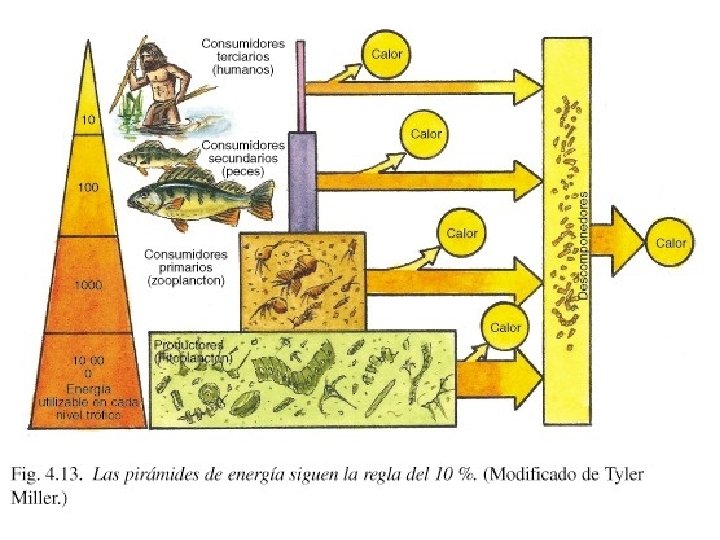 FLUJO DE ENERGÍA ü Primera ley de la termodinámica: la energía no se crea ni desaparece, solo sufre transformaciones. ü Segunda ley de la termodinámica: una parte de la energía de va perdiendo en forma de calor y al pasar de una forma a otra y se pierde. PRODUCTORES CALOR CONSUMIDOR PRIMARIO CALOR CONSUMIDOR SECUNDARIO CALOR CONSUMIDOR TERCIARIO CALOR CONCLUSIÓN: EN UN ECOSISTEMA, LA CANTIDAD DE ENERGÍA CON QUE SE PARTE, VA DISMINUYENDO AL AVANZAR EN NIVELES TRÓFICOS.