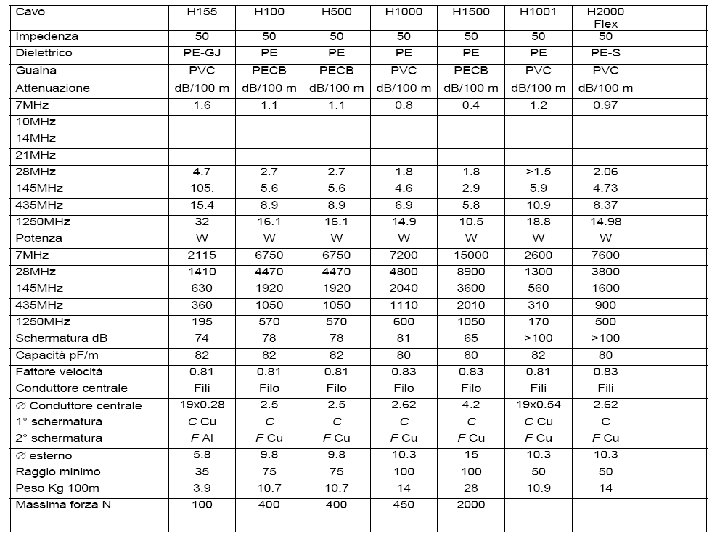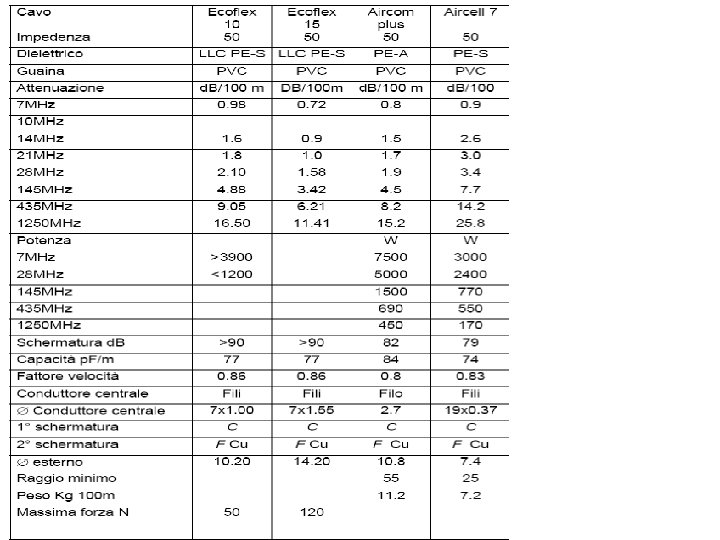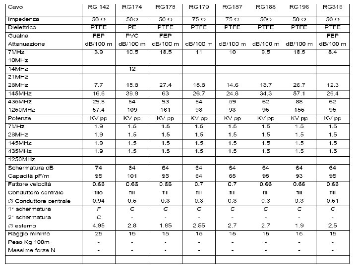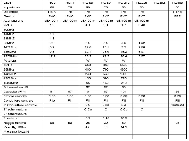 Attenuazione cavi d. B / 100 m Tipo cavo RG 58 A/U RG 58/U RG 8/X RG 213/U 50 MHz 11. 1 10. 8 4. 1 8. 7 5. 6 100 MHz 15. 6 6. 3 12. 8 7. 6 200 MHz 22. 3 23. 6 9. 4 18. 8 11. 1 400 MHz 31. 3 35 14. 6 27. 8 16. 3 700 MHz 41. 7 48. 7 20. 2 38. 6 24 900 MHz 48 55. 7 23. 3 44. 5 27. 8 Formula di calcolo attenuazione: RL=R*L/100 ALL=RL*SQRT(FA/FR) R: valore conosciuto della perdita ad una data frequenza (d. B/100 m o d. B/100 ft) L: lunghezza del cavo (m o ft) FR: frequenza alla quale è data la perdita (MHz) FA: frequenza di lavoro alla quale si vuole calcolare la perdita (MHz) ALL: perdita totale del cavo a lunghezza L e frequenza FA