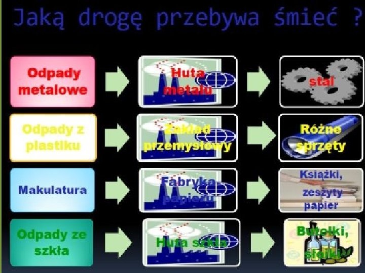 Dlaczego warto segregować śmieci ? • zmniejszamy ilość i szkodliwość odpadów trafiających na składowisko; • gdyby posegregowane butelki i puszki ponownie przetworzyć, wówczas… z 27 plastikowych butelek można wyprodukować jedną bluzę z polaru, z 19 000 puszek po konserwach 1 samochód, a z 670 puszek po napojach gazowanych – 1 rower. • selektywna zbiórka makulatury ogranicza zużycie energii, wody i zanieczyszczenia powietrza, a tym samym chroni lasy (wyprodukowanie 1 tony papieru powoduje ścięcie 17 drzew, ze 100 ton makulatury wyprodukować można 90 ton papieru); • odzyskując aluminium ze złomu oszczędzamy 95% energii potrzebnej do wyprodukowania aluminium z rudy boksytu, a recykling aluminium to 95% mniej zanieczyszczeń doprowadzanych do powietrza i 97% do wody; • poddając tworzywa sztuczne powtórnemu przerobowi oszczędzamy węgiel i ropę naftową