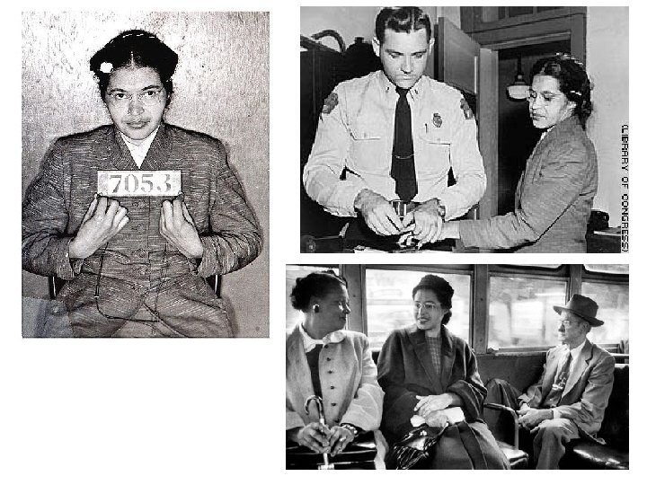 A woman named Rosa Parks sat on a bus in Montgomery, Alabama. Under state law African Americans were to sit in the back of the bus. They could only sit in the middle if no white passengers wanted those seats. Parks was asked to move so a white passenger could have her seat, she refused. Parks was arrested and sent to jail.