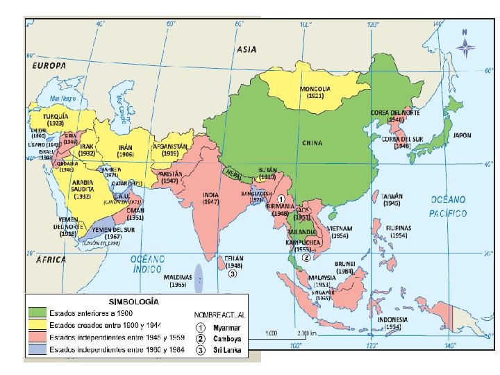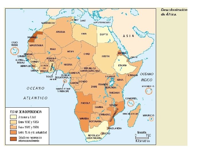 Descolonización de Asia y África - Proceso por el cual los pueblos sometidos al colonialismo durante el siglo XIX adquieren independencia política. - Tiene su origen tanto en el ansia de independencia de los pueblos colonizados como en la Declaración de los Derechos del Hombre se sostiene que “…todos los pueblos tiene derecho a disponer de sí mismos”, y en la política de la Asamblea General de la ONU (diciembre 1952)que acordó una resolución que hacía de éste objetivo un deber solidario de las naciones. - Entre 1945 y 1966 se independizaron 54 países, todos pertenecientes a la geografía del Tercer Mundo.