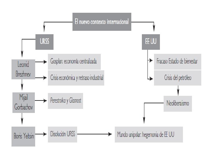 CRISIS EN LA URSS: 1. Conflictos étnicos. 2. Nacionalismos. 3. Repúblicas soviéticas luchan por su independencia. 4. Oleada de revoluciones en los países del Este. 5. El gobierno no reprime. GORVACHOV RENUNCIA A FINES DE 1991 LE SUCEDE EN EL PODER BORIS YELTSIN QUIEN IMPLANTÓ UN SEVERO PROGRAMA DE REFORMAS NEOLIBERALES. LA UNIÓN SOVIÉTICA DESAPARECE PARA DAR MÁS TARDE ORIGEN A LAFEDERACIÓN RUSA.