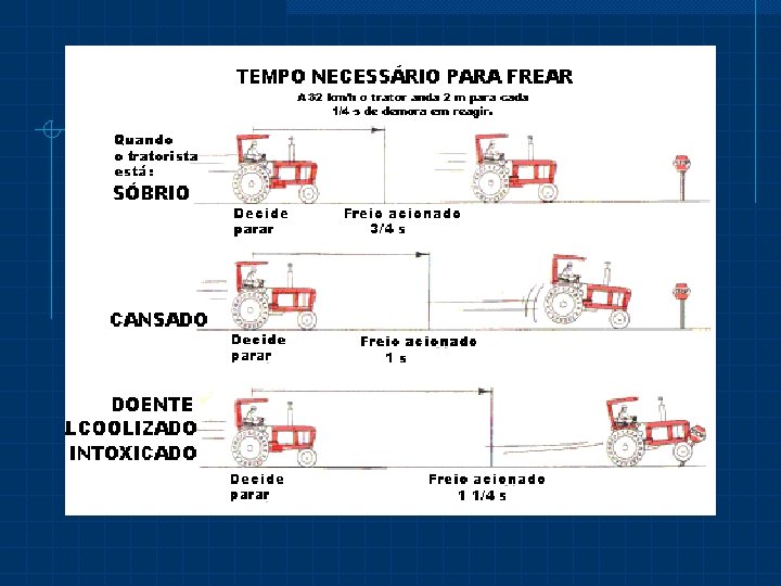 Da ilustração acima concluímos que: a) a reação do tratorista sóbrio dará tempo para evitar o perigo, parando à tempo; b)no caso do tratorista cansado, o longo tempo de reação, fará com que pare o trator quase em cima do obstáculo; e c)o tratorista doente, embriagado ou intoxicado, não evitará um acidente (às vezes) grave. Pense em como você reagiria às várias situações de emergência, antes que seja submetido a elas. Isso pode ajudá-lo a reagir mais rápido nessa emergência. Sabendo que o cansaço e o álcool, por exemplo, diminuem o seu tempo de reação, evite-os quando for dirigir o trator.
