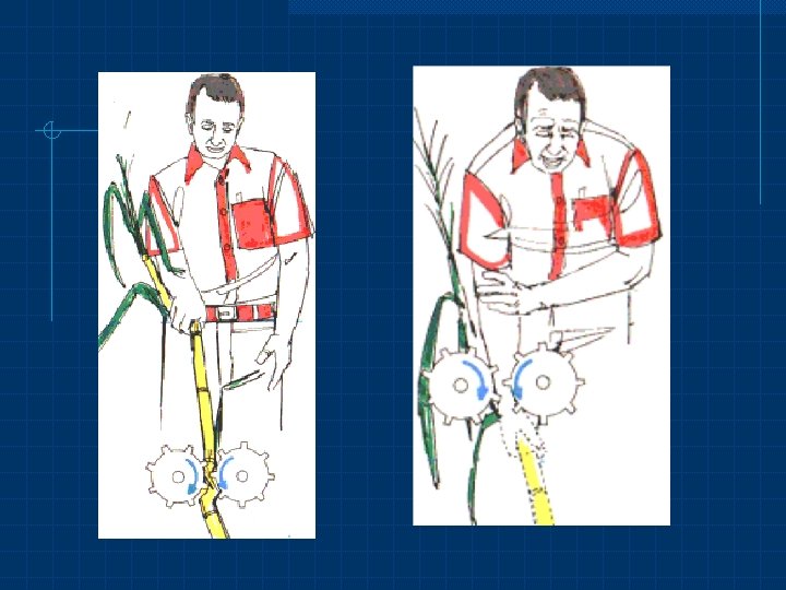 No corte manual da cana-de-açúcar, o trabalhador rural esta sujeito a: cortes nas mãos, pernas e pés, provenientes da utilização do facão, foice ou podão. Além de lombalgias, dores musculares, lesões oculares, irritação da pele, quedas e ferimentos. Principais Causas dos Acidentes • Ato inseguro (falha humana) • Ferramentas defeituosas • Ferramenta mal utilizada • Uso incorreto da ferramenta • Má conservação da ferramenta e • Guarda em local inseguro.
