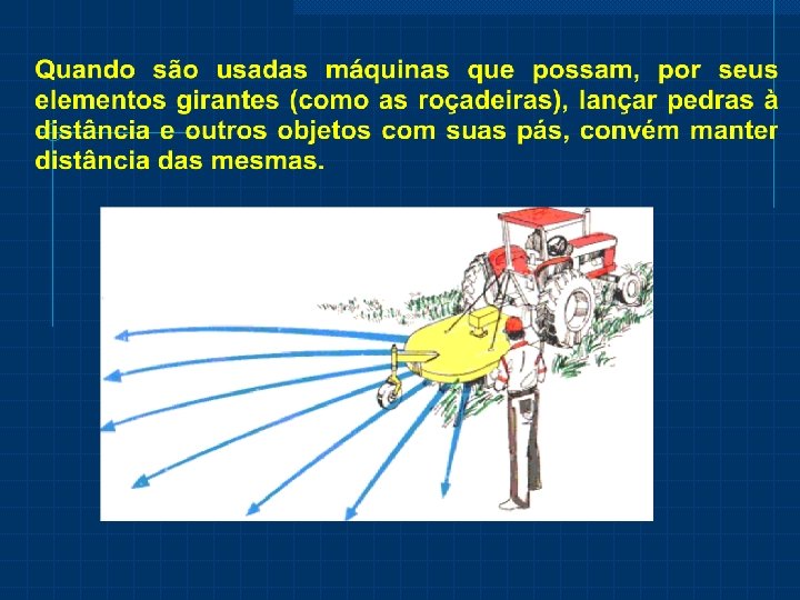 2. Máquinas e Implementos Agrícolas Tipos de Riscos Lesões traumáticas; Lesões aos órgãos dos sentidos; Outros danos à saúde. Medidas Gerais de Segurança Condições seguras; Medidas de segurança aos implementos em geral.
