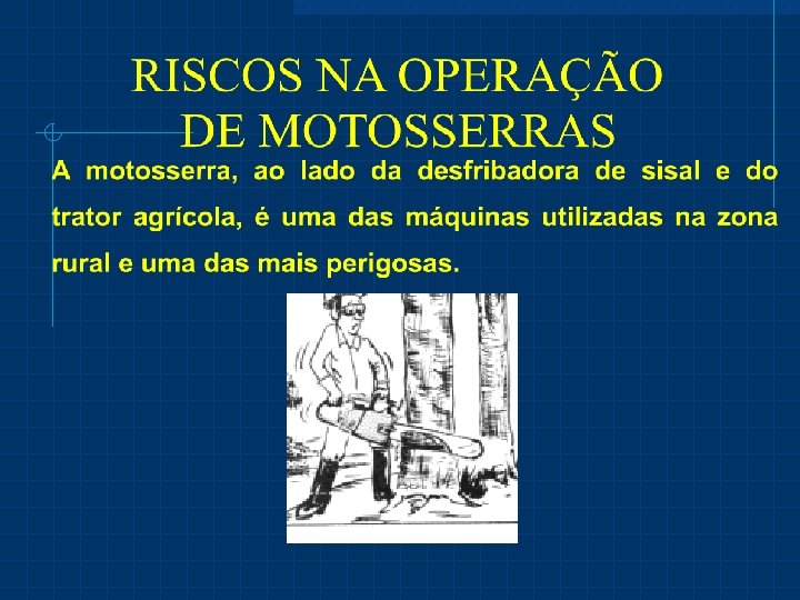 Somente o uso do facão é responsável por 65% das ocorrências Na zona rural, os equipamentos manuais são usados: • Na residência (chave de fenda, alicate, martelo, etc) • Na oficina (serrote, furadeira, serra circular, etc. ) • No plantio (enxada, trado, motosserra, etc. ) • Na colheita (foice, facão, alicate, etc. ) e • Em outros serviços (construÇÕes rurais, tratos culturais, etc. )