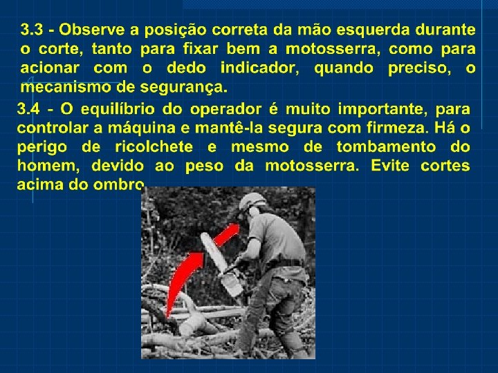 4. Concentre-se no seu trabalho: evite brincadeiras, conversas, a pressa e o mau humor 5. As ferramentas deverão ter cabos corretos, com encaixes justos, de tamanho apropriado e 6. Manter as ferramentas de corte constantemente afiadas, pois quando as lâminas estão gastas (rombudas), requerem pressão excessiva e "marteladas" para funcionarem; movimente a lâmina, sempre, em direção oposta ao corpo humano