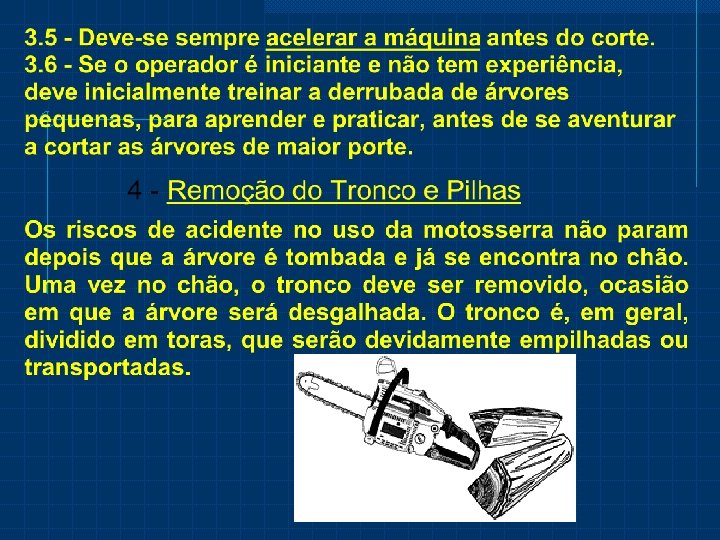 USO DE FERRAMENTA A GASOLINA 1 - Exigem o uso de E. P. I. , guarda segura, bom estado de conservação e uso correto. 2 - O reabastecimento merece cuidado especial: a) esteja certo de que a máquina esfriou, antes de reabastecer; b) reabasteça em áreas ventiladas; c) recoloque a tampa do tanque e enxugue os respingos; e d) não fume em serviço. 3 - Leia e siga o Manual de Operação, bem como as advertências escritas no equipamento. 4 - Use todos os dispositivos de proteção.