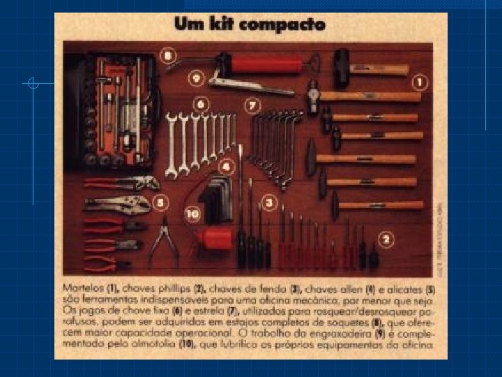 MEDIDAS PREVENCIONISTAS A lei diz que as ferramentas manuais devem ser apropriadas ao uso a que se destinam e devem ser mantidas em perfeito estado de conservação, sendo proibida a utilização das que não atendam a essas exigências. Seguem-se algumas medidas necessárias à prevenção de acidentes: 1. Arrumar cuidadosamente as ferramentas em painéis apropriados: sente-se a falta da ferramenta; não há acúmulo sobre a bancada; e não ficam abandonadas no chão. Ou guarda-las no estojo próprio.