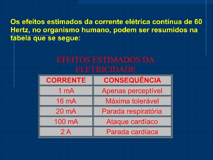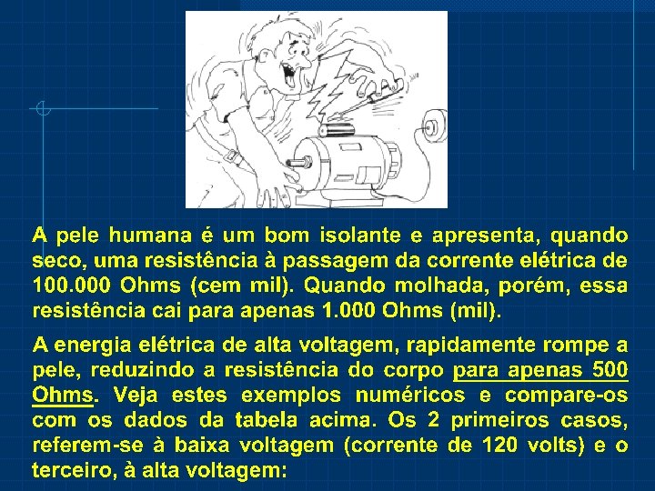 4. Eletricidade Fatores causadores de acidentes elétricos Intensidade da corrente elétrica; O tempo de exposição à tensão; O percurso da corrente pelo corpo; As condições de isolação à terra do corpo humano; e A capacidade de reação do organismo. Tensão perigosa ao organismo humano Uma tensão de 110 V pode ser fatal dependendo das condições: roupas úmidas, sem EPI, piso molhado, etc.
