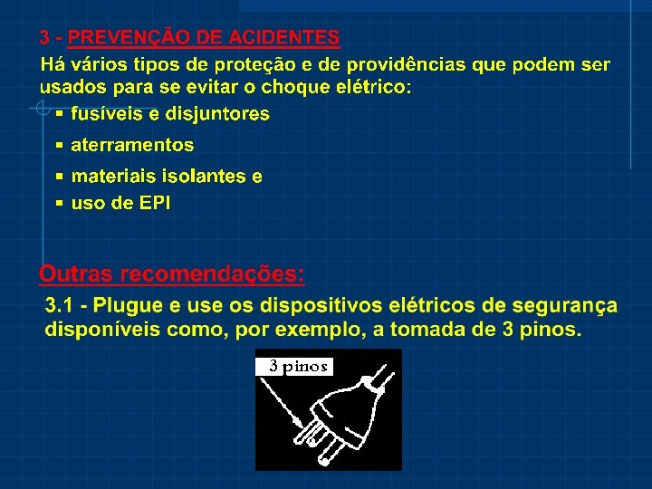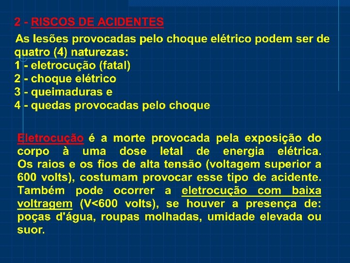 4. Eletricidade Tensão de segurança: 0 a 25 V; Baixa tensão: 25 a 600 V; Alta tensão: 600 V em diante. Causa dos acidentes Ato inseguro; Condição insegura; e Fator pessoal inseguro.