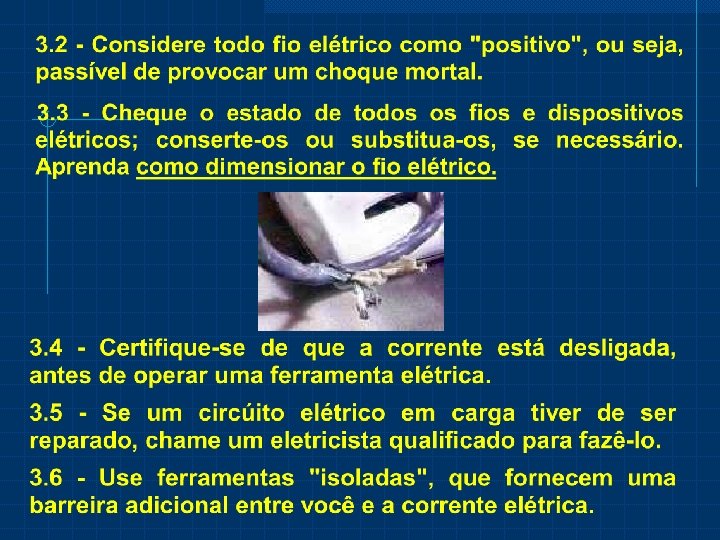 USO DE FERRAMENTAS ELÉTRICAS 1 - Devem ter proteção contra choques ou eletrocussão: isolante duplo, tomada de três pinos e interruptores. 2 - Evite operar em áreas alagadas ou úmidas: use luvas e botas apropriadas. 3 - Nunca carregue ferramentas pelo fio; nunca as desconecte com um puxão. 4 - Sempre desligue as ferramentas quando não em uso, assim como antes de operá-lá e ao trocar acessório. 5 - Ferramenta danificada deve ser removida do serviço e deve ser afixado o aviso: "NÃO USE".