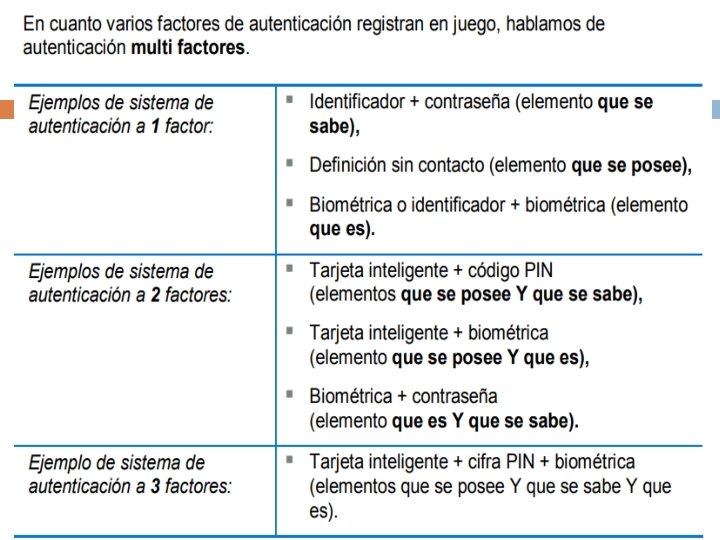 Seguridad Informática Los usuarios deben de poder probar que realmente son quien dicen ser…. Tipos de autenticación: � Por factores: De un factor: Algo que yo se. De dos factores: Algo que yo se y algo que yo tengo. De tres factores: Algo que yo se, algo que yo tengo y algo que yo soy *. *Algo que yo hago