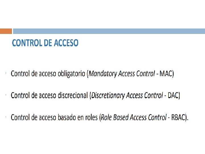 MAC El control de acceso mandatorio (Mandatory Access Control – MAC) es una política de control de acceso determinada por el sistema no por el dueño de un recurso. Clasifica a sujetos y objetos en niveles de seguridad. Se utiliza en sistemas multinivel que procesan información altamente sensible. ejemplo información gubernamental o militar