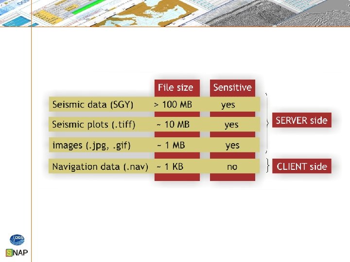Mixed Server side-client side paradigm (Data access control) Seismic Data: - remains within the server - processed within server - sends to the client only jpg, png, gif Positioning: - sent to the client (SVG) - Rendered by the client Based on opensource software only (PHP, Apache…)