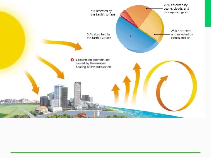 Heating Earth § Our planet only receives about two-billionths of the sun’s energy § About half the energy that reaches the atmosphere will pass though to Earth’s surface § The rest is absorbed or reflected in the atmosphere by clouds, gases, and dust, or by the Earth’s surface § Oceans and land radiate energy back into the atmosphere – so the Earth doesn’t overheat!
