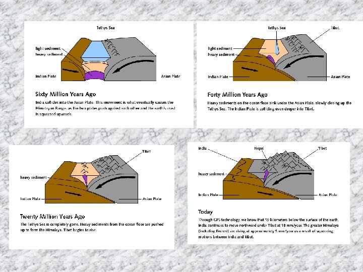 • Gangetic plain- Pleistocene to recent alluvial deposits over 1000 m thick. • Sub-Himalaya – Consists of about 5 km thick Neogene molasse sediments of Siwaliks overthrust by older Lesser Himalayan rocks along MBT. • Lesser Himalaya- Consists of intensely folded metasedimentary rocks between MBT and MCT. • Higher Himalaya- thick sequence of higher Himalayan crystalline and overlying Tethyan sedimentary rocks.
