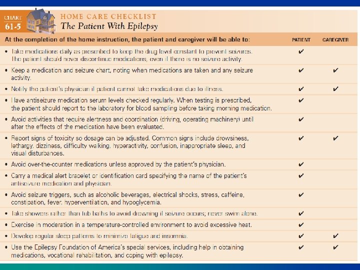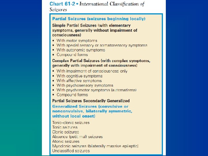 Medical Management vindividualized (some forms arise from brain damage and others from altered brain chemistry) v. Pharmacologic Therapy – the exact mechanisms of action are unknown. – The objective: to achieve seizure control with minimal side effects. – Does not cure seizures. – Selected on the basis of the type of seizure and the effectiveness and safety of the medications. Table 61 -4 lists the medications.