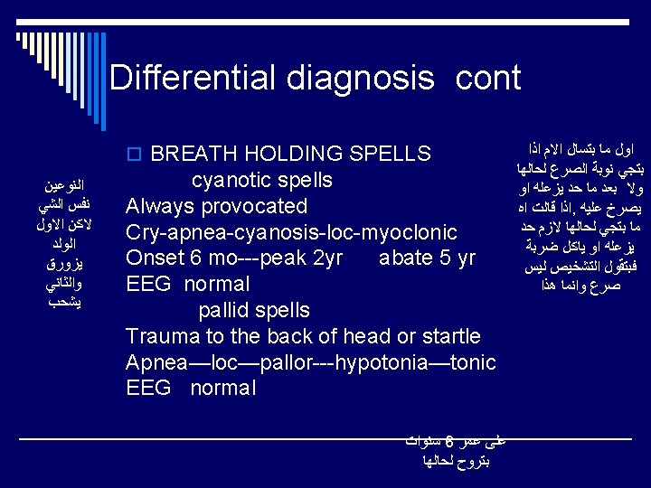 Differential diagnosis cnt SYNCOPE Decrease blood flow----hypotension Loss of conciousness—deviation of eyes Provoked by pain fear excitement Rare before 10 -12 years More in females