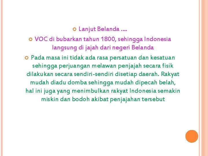 Lanjut Belanda …. VOC di bubarkan tahun 1800, sehingga Indonesia langsung di jajah dari negeri Belanda Pada masa ini tidak ada rasa persatuan dan kesatuan sehingga perjuangan melawan penjajah secara fisik dilakukan secara sendiri-sendiri disetiap daerah. Rakyat mudah diadu domba sehingga mudah dipecah belah, hal ini juga yang menimbulkan rakyat Indonesia semakin miskin dan bodoh akibat penjajahan tersebut