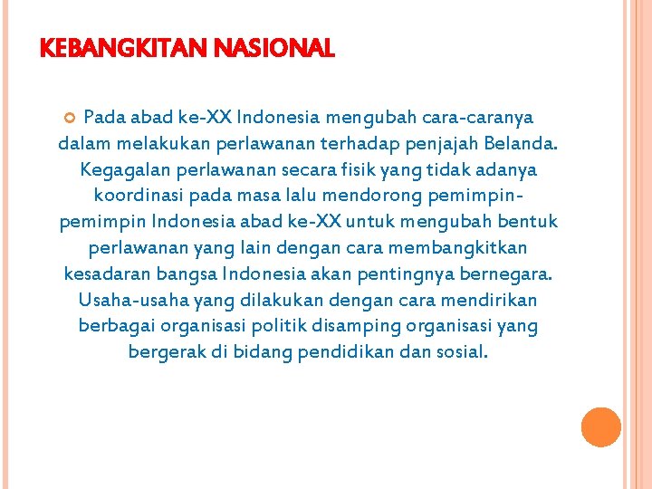 KEBANGKITAN NASIONAL Pada abad ke-XX Indonesia mengubah cara-caranya dalam melakukan perlawanan terhadap penjajah Belanda. Kegagalan perlawanan secara fisik yang tidak adanya koordinasi pada masa lalu mendorong pemimpin Indonesia abad ke-XX untuk mengubah bentuk perlawanan yang lain dengan cara membangkitkan kesadaran bangsa Indonesia akan pentingnya bernegara. Usaha-usaha yang dilakukan dengan cara mendirikan berbagai organisasi politik disamping organisasi yang bergerak di bidang pendidikan dan sosial.