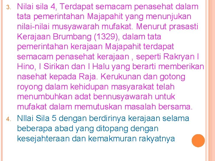 3. 4. Nilai sila 4, Terdapat semacam penasehat dalam tata pemerintahan Majapahit yang menunjukan nilai-nilai musyawarah mufakat. Menurut prasasti Kerajaan Brumbang (1329), dalam tata pemerintahan kerajaan Majapahit terdapat semacam penasehat kerajaan , seperti Rakryan I Hino, I Sirikan dan I Halu yang berarti memberikan nasehat kepada Raja. Kerukunan dan gotong royong dalam kehidupan masyarakat telah menumbuhkan adat bennusyawarah untuk mufakat dalam memutuskan masalah bersama. Nllai Sila 5 dengan berdirinya kerajaan selama beberapa abad yang ditopang dengan kesejahteraan dan kemakmuran rakyatnya