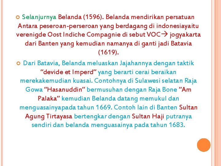 Selanjurnya Belanda (1596). Belanda mendirikan persatuan Antara peseroan-perseroan yang berdagang di indonesiayaitu verenigde Oost Indiche Compagnie di sebut VOC jogyakarta dari Banten yang kemudian namanya di ganti jadi Batavia (1619). Dari Batavia, Belanda meluaskan Jajahannya dengan taktik “devide et Imperd” yang berarti cerai beraikan merekakemudian kuasai. Contohnya di Sulawesi selatan Raja Gowa “Hasanuddin” bermusuhan dengan Raja Bone “Am Palaka” kemudian Belanda datang memukul dan menguasainyapada tahun 1669. Contoh lain di Banten Sultan Agung Tirtayasa bertengkar dengan Sultan Haji putranya sendiri dan belanda menguasainya pada tahun 1683.