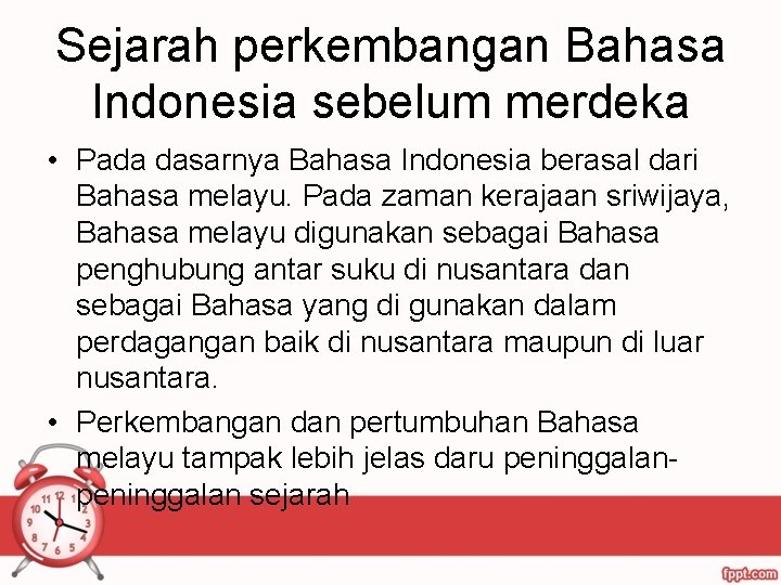 Sejarah perkembangan Bahasa Indonesia sebelum merdeka • Pada dasarnya Bahasa Indonesia berasal dari Bahasa melayu. Pada zaman kerajaan sriwijaya, Bahasa melayu digunakan sebagai Bahasa penghubung antar suku di nusantara dan sebagai Bahasa yang di gunakan dalam perdagangan baik di nusantara maupun di luar nusantara. • Perkembangan dan pertumbuhan Bahasa melayu tampak lebih jelas daru peninggalan sejarah