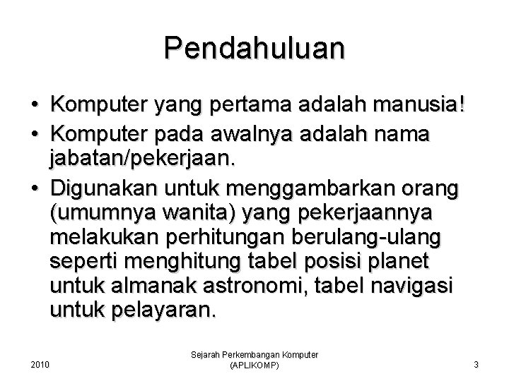 Pendahuluan • Komputer yang pertama adalah manusia! • Komputer pada awalnya adalah nama jabatan/pekerjaan. • Digunakan untuk menggambarkan orang (umumnya wanita) yang pekerjaannya melakukan perhitungan berulang-ulang seperti menghitung tabel posisi planet untuk almanak astronomi, tabel navigasi untuk pelayaran. 2010 Sejarah Perkembangan Komputer (APLIKOMP) 3