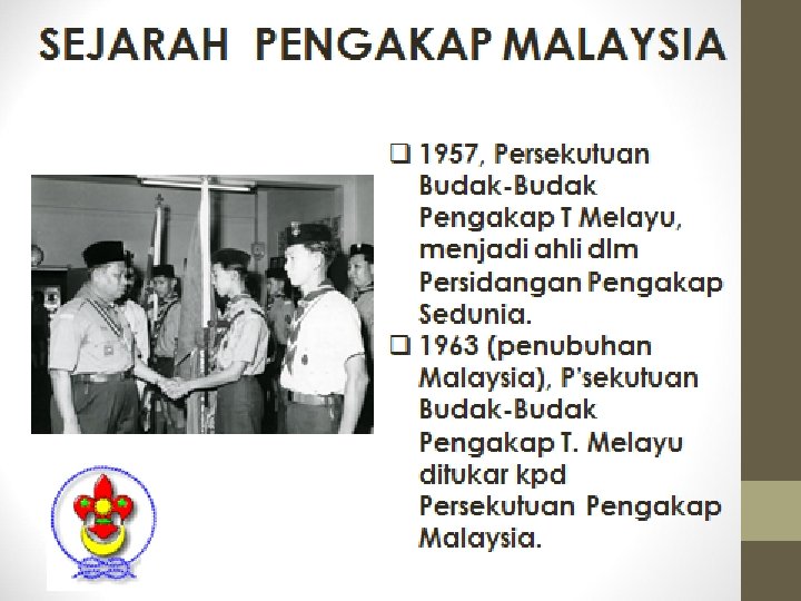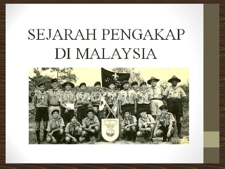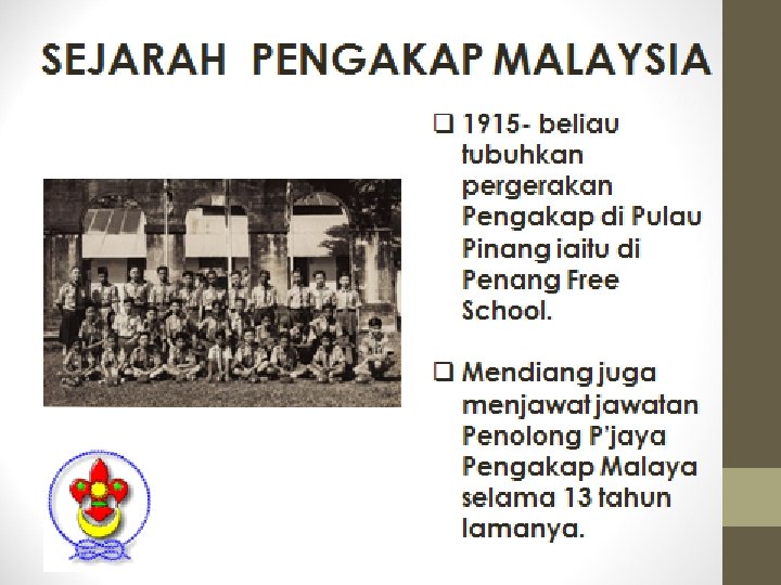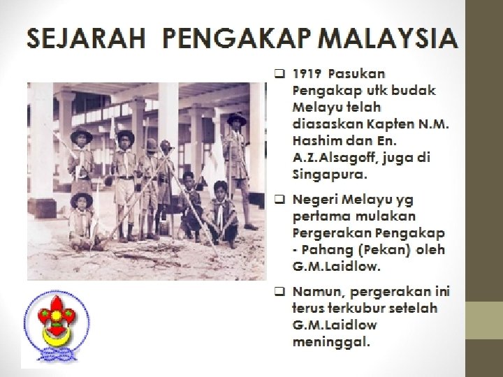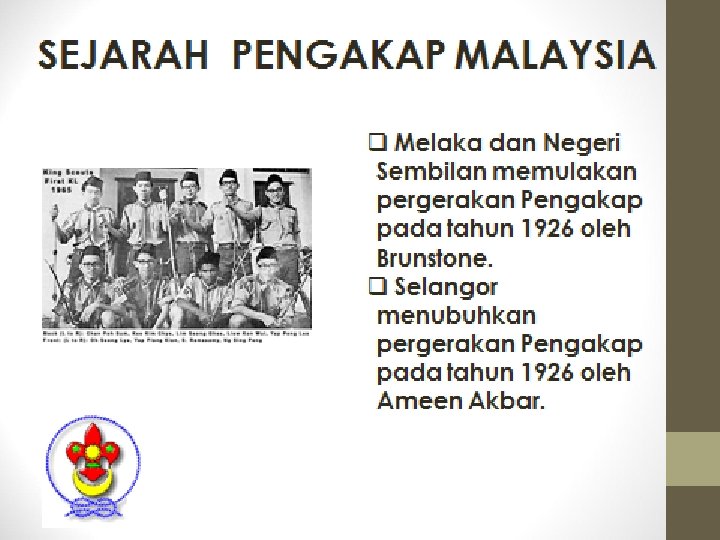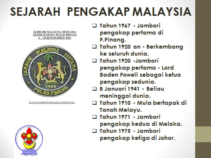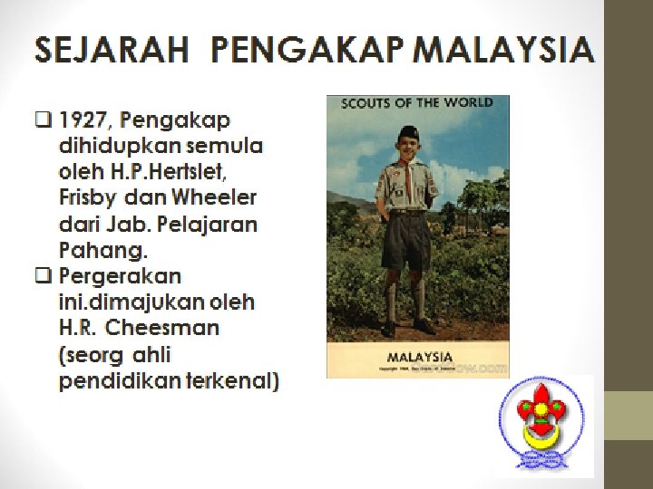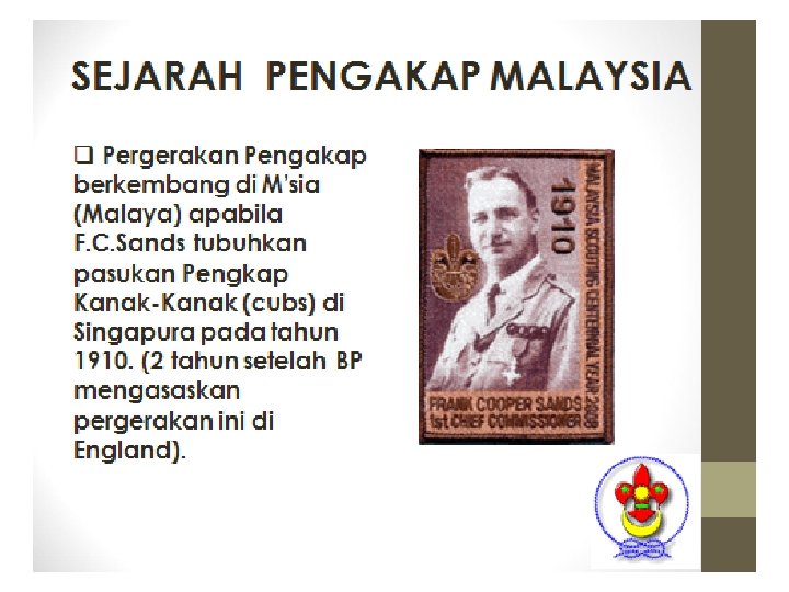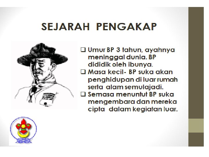 q BP mengembangkan ideanya dlm buku bertajuk “Aids to Scouting”. q Selepas perang Boer, BP menjadi ketua pasukan polis Afrika Selatan. Beliau mereka cipta pakaian seragam (baju, seluar pendek, skaf, dan topi bertepi lebar yang m’pengaruhi pakaian seragam pengakap. q BP ambil warna hijau & kuning dari pakaian itu sebgai warna pengakap.