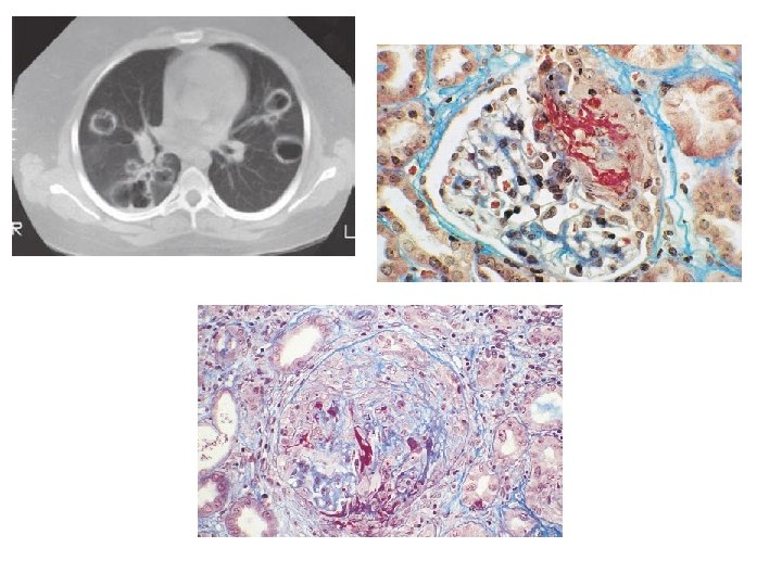 Granülomlu Polianjiitis • Üst ve alt solunum yollarının “nekrotizan granülamatoz inflamasyonu” • 8. 5 /milyon kişi , E=K 1: 1 • Beyaz ırk, sıklıkla 40 -55 yaş • % 90 akciğer tutulumu (+) multipl, bilateral, nodüler kaviter lezyonlar • Böbrek tutulumu başlangıçta fokal, segmental GN görülürken kısa sürede HİGN (kresentik GN) formuna dönüşür. Böbrek biyopsisinde granülom görülmesi nadirdir. • PR 3 -ANCA pozitif