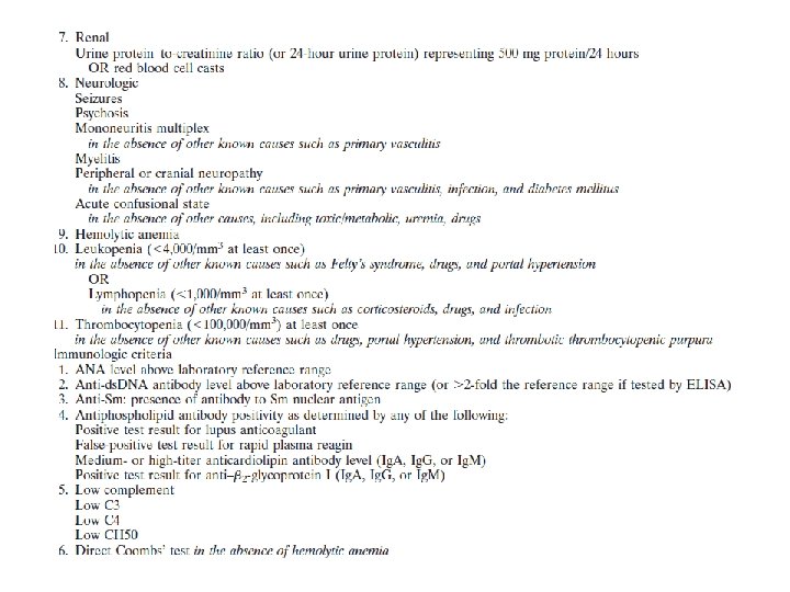 SLE Tanısı 1) En az biri klinik veya immünolojik kriter olmak kaydı ile 4 kriter varlığında konur (3 klinik+1 immünolojik kriter, 1 klinik+3 immünolojik kriter) 2) Lupus nefriti ile uyumlu böbrek biyopsisi +ANA veya anti-ds. DNA pozitifliği